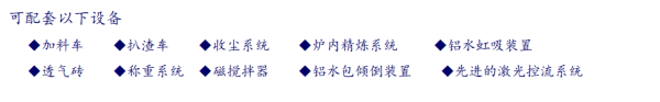 您可以根据工艺需要,配套加料车、扒渣车、收尘系统、炉内精炼系统、铝水虹吸装置、透气砖、称重系统、磁搅拌器、铝水包倾倒装置,甚至是先进的激光控流系统。