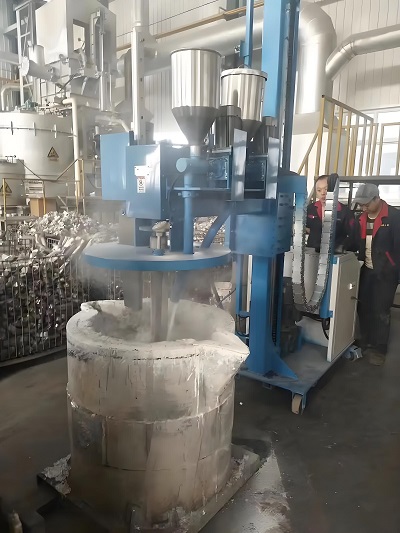 我指着图纸给他解释:“您看,纯除气只通氮气,主要除氢。一体机不但通氮气,还可以自动添加精炼剂(如无钠精炼剂、除渣剂),除气的同时把铝液里的氧化夹渣也去掉。处理一炉5-6分钟,比纯除气快一倍,而且除渣效果好,耙渣里含铝极少,节约铝料成本。”